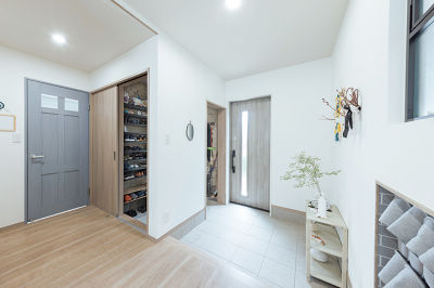 シューズクロークを設けゲストにも配慮した玄関。壁厚を利用したスリッパ収納も好評だそう。