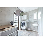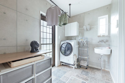 玄関からアクセスしやすいオープンな洗面室。ランドリーとは間仕切って、ネイルルームのお客様も使いやすく。