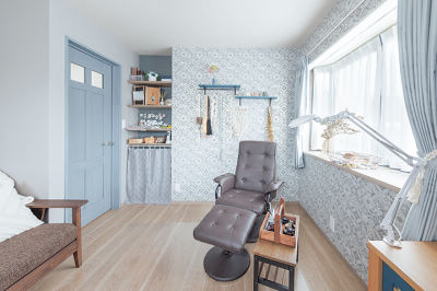 ネイルルームはペールブルーを基調に仕上げました。奥様のセンスが光る素敵な空間にゲストも癒されます。