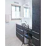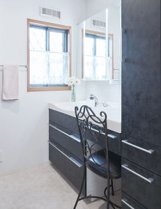 洗面室も広めに確保し収納を充実。専用の照明を設置し、メイクコーナーとして使われています。