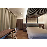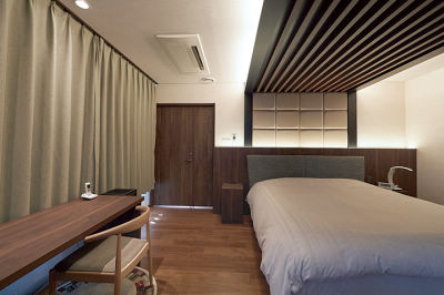 壁面のレザー調スクエアの装飾と天井のルーバーが印象的。やさしいあかりの間接照明で、ゆったりくつろげる寝室になりました。