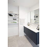 並んで使える幅1.2mの洗面ドレッシング。足元がすっきりとしたセミフロートタイプで、収納もたっぷり。