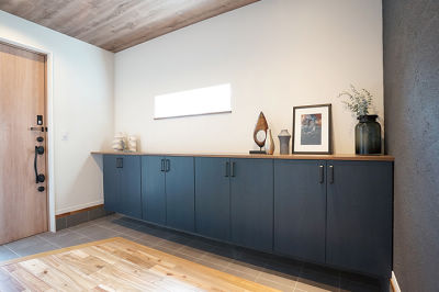 ご友人が大勢訪れてもゆとりのある広々玄関。シューズボックスは幅3.5mあり、たっぷり収納できます。