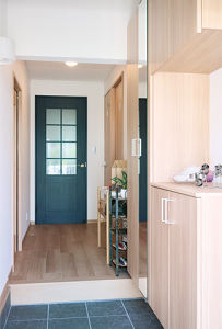 大容量の収納で玄関すっきり。ネイビー色の室内ドアは採光タイプで、空間を広く感じさせます。