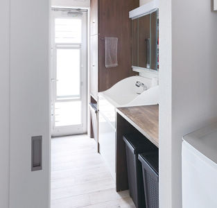 引き戸で仕切って独立できる洗面室。つくり付けの家具を再利用し、洗濯機の配置を変えて洗濯がラクになりました。