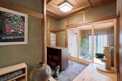 リビング側の玄関ホールの一部も土間にして、お客様をお迎えするスペースを新設。猫もお客様もくつろぎのスペースになりました。
