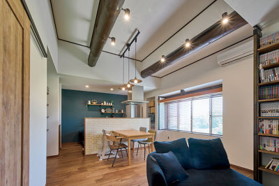 梁を見せた、開放的な天井のLDK。キッチンの腰壁をタイル仕上げに、床を深みのあるチェリー柄にしてヴィンテージ感を高めました。