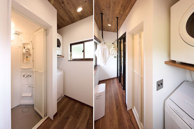 シャワーブース前の脱衣室はランドリースペースとして、窓際に洗濯物を干せるように設計しました。
