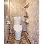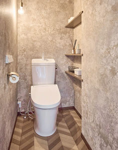 遊び心のある照明や床材を使用したこだわりのトイレ。ヘリンボーン柄の床が空間のアクセントに。