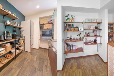 木目柄の棚板で造作したオープン収納を、キッチン背面とリビングに配置。取り出しやすく、よく使うモノの置き場所として便利です。
