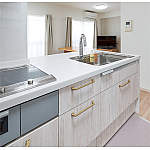 垂れ壁をなくすことでリビング側とつながり、すっきり明るくなったキッチン。パントリーを設けて収納力もアップしました。
