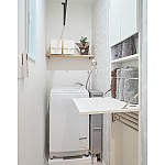 洗面室はコンパクトながら、物干しを設置し、タオルや小物をしまえる埋め込み収納をしつらえました。