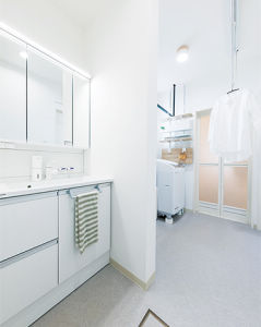 ワイドな洗面ドレッシングで収納力アップ。脱衣室で洗濯物を洗って干せるので、家事動線がぐっと短くなりました。