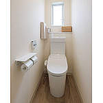 壁紙を白で統一した、清潔感あふれる2階のトイレ。窓側に設けたカウンターには小物などを飾ることもできます。