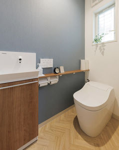ホワイトのタンクレストイレと、くすみブルーのアクセントクロス。ほっと落ち着ける空間です。