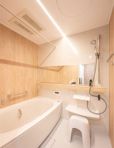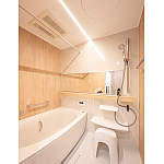 やさしい木目柄の壁とライン照明で、癒しの空間に。掃除をラクにする機能にこだわった浴室です。