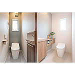 全自動お掃除トイレを採用。2階は洗面カウンターの扉をチェリー柄にして、落ち着きのある空間に。