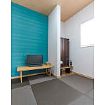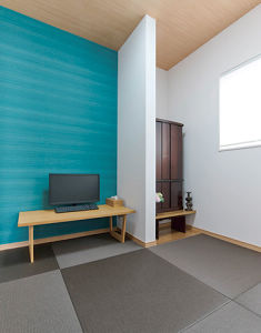 仏間も兼ねた書斎はご主人のお気に入りの色でコーディネイト。琉球畳を選び、モダンにしつらえました。