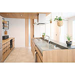 キッチンは木目を活かしたコーディネイト。吊り戸棚をなくして圧迫感を解消。リビングの床もキッチンの色柄に合わせて統一感を出しました。