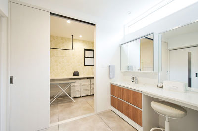家事室の広いカウンター下に、普段使いの衣類を収納。隣接する洗面室で脱いだ衣類は家事室の洗濯かごに入れることができ、洗濯動線がラクに。