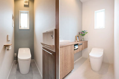 全自動お掃除トイレを採用。2階は洗面カウンターの扉をチェリー柄にして、落ち着きのある空間に。