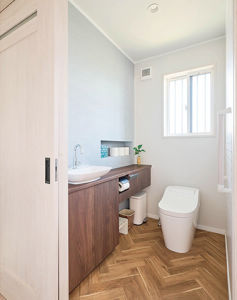 トイレは0.75坪を確保して、介護しやすく。壁の厚みを利用しトイレットペーパー収納用のニッチを新設。ヴィンテージ感漂う空間に仕上げました。