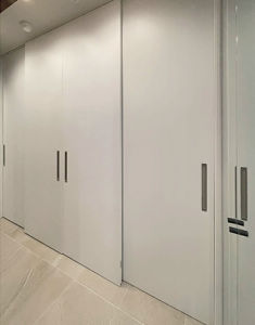 夫婦のクローゼットを一か所に集約。壁と一体感のある4枚の引き戸は、大きく開けられて使い勝手も抜群です。