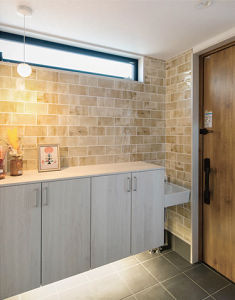 やわらかな間接照明が訪れる人をあたたかく迎える玄関。壁はタイル仕上げで高級感ある印象に。便利な手洗い場も設置しました。