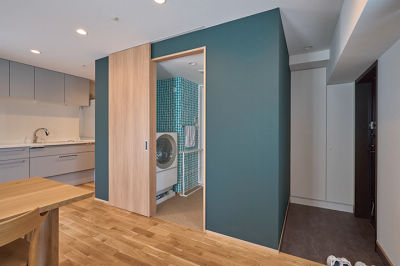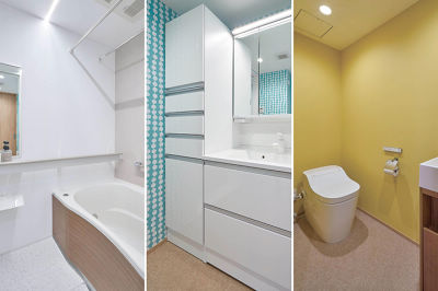 リビング側からは浴室・洗面脱衣室に、キッチン側からはトイレに入れるよう配置した水廻り。「設備が新しくなり、身支度や家事がラクになりました」とS様。