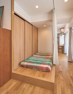 奥様の寝室として、小上がりのお部屋を新設。日中はカーテンを開け、隣接する部屋の一部としても使えるようになっています。