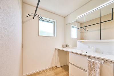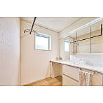 ゆとりのある洗面ドレッシングで家族が並んで身支度できます。天井には、部屋干し用のバーも設置しました。
