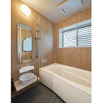 キレイが長続きする、見た目も美しいバスルームに一新。木目調の壁面で落ち着いた雰囲気に。