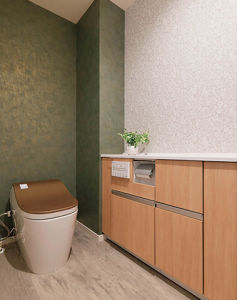 上品な色合いの便ふたを採用。グリーンのアクセント壁、グレイッシュの床と調和して華やかで落ち着きを感じさせます。