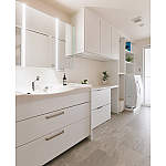 洗面室のメイクアップスペースは、まるでサロンのような空間に。機能性をもたせながら、かわいらしさにこだわりました。