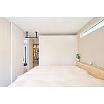 主寝室のベッドには小物などを置けるヘッドボードをヒノキ材で造作。爽やかなヒノキの香りが広がります。