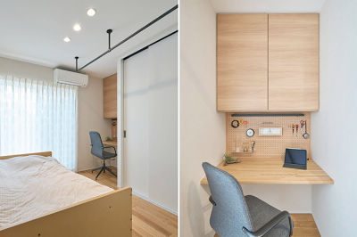 普段は書斎兼、室内干しスペースとして。お子様が帰省時に泊まれるようにベッドも備えています。