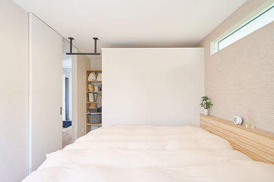 主寝室のベッドには小物などを置けるヘッドボードをヒノキ材で造作。爽やかなヒノキの香りが広がります。