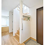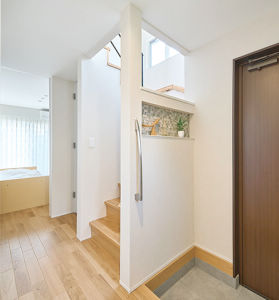階段の踊り場から光を取り込むため、壁に開口を設け玄関を明るく。