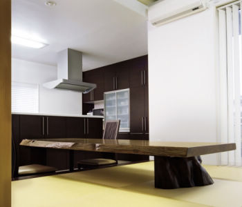 建替えプランの中心は、畳コーナーのあるアイランド型オープンキッチン。南東の角にLDKを配置して中庭を設けることで、大きな開口部から明るい日差しと風を採り込めます。空間をすっきり広く使うため、壁面と畳コーナーの段差を活用して収納も充実させました。