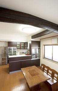 梁とキッチンの色を同色系にして、統一感のある空間に。