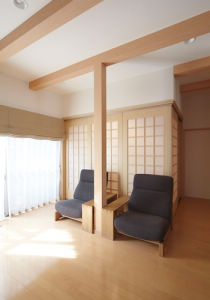 畳コーナーの間仕切りを閉めたところ。この椅子でくつろぐのがご主人の何よりの楽しみだとか
