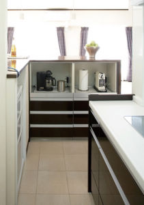 カウンターの内側にスペースを設け、奥様が好きな家電をたっぷり収納
