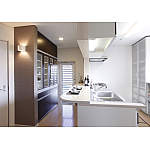 キッチンは広いものの収納が少なくモノが溢れていたS様邸。リフォームにあたっては、約2畳の大きな独立パントリーを設けました。中央に配したキッチンの背面には家電収納、正面にはカップボードを備え、さらに床下収納も設置。壁面はブラケット照明で光のアクセントをつくりました。ダークブラウンとホワイトを基調にした明るく落ち着いた、まるで奥様のラウンジのようなキッチンとなりました。