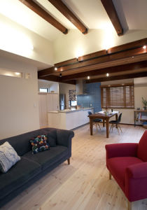 お子様の誕生をきっかけに、ご実家に戻ることにされたM様。2階の4人兄弟の個室を撤去し、LDKと寝室の大きく2つにゾーニング。さらに、北側を増築して1階と同位置に水廻りを配置。家事動線を短縮するとともに、両世帯が互いに気兼ねなく生活できるように配慮しました。「新しいものより古いもの、時間を経て素敵に変化していくものが好きですね」というお二人。好きな映画や雑誌を参考に、好みのテイストを共有しながら、丁寧に空間デザインや素材を決定していきました。リビングの天井は撤去して高い勾配天井とし、あらわしにした梁と金具にはアンティーク風の塗装を施しました。逆にダイニングは既存の天井高を活かしながら、唐松の天然木を張り、家族が落ち着いて団らんできる空間に。各部屋にはテーマカラーを設定し、ブルー・パープル・グリーンなどの北欧調のスモーキーな色が壁面を美しく飾っています。「好きなモノに囲まれて居心地がよく、家族をより近く感じられる住まいになりました」と話されています。