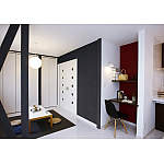 畳コーナーには藍色の壁紙を、パソコンコーナーにはレッドの壁紙を採用し、個性的な空間に。パソコンコーナーはリビングからは見えない位置に配置。引戸の丸い採光部が奥の寝室へリビングの光と気配を伝えます