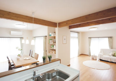 和室2間をつないだL字型のLDK全景。梁は建具の色に合わせて塗装し、