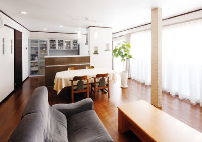 定年後の生活は、ワンフロアー内でできるようにと考えたK様。和室を撤去しLDKにとお考えでしたが、構造上どうしても抜けない壁と柱がネックになっていました。そこで、構造壁を飾り棚にアレンジし、ハイステップの対面キッチンに取り込むプランを採用。また、柱は補強も兼ねて太くし、タイル調に装飾することで空間のアクセントになりました。さらに、キッチン横に配置した洗面室も、ガラスブロックで採光が確保できるよう工夫。老朽化した設備を入れ替えながら、デザイン性にもこだわった理想の生活空間が実現しました。