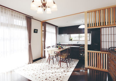 築29年を経て水廻りの老朽化が気になっていたM様ご夫妻。暗かった台所は、間仕切りを撤去することで、明るく開放感のあるLDKとなりました。構造上抜けない柱は、以前、和室にあった障子を再利用して、空間をゆるやかに仕切るデザイン壁に。長年愛用してきた食器棚は塗装し、上段は飾り棚に、下段はキッチンのハッチカウンターとして生まれ変わりました。家具やキッチンの扉はエクセルダーク色でまとめ、和モダンな雰囲気を演出。愛着ある家具に囲まれた、心落ち着く二人のくつろぎの場所ができあがりました。