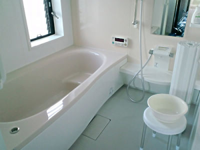 狭く寒い浴室と収納量の少ない洗面所をリフォーム。1216から1616サイズのシステムバスに変更し、洗面所が狭くなった分、壁面に造りつけた収納家具で収納量を増やした。