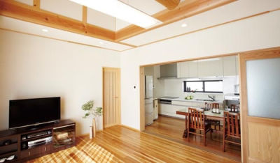 増築を重ねた住まいについて、「どうにかしなくては」と検討されていたK様。段差の多さも不満となり、建替を決断されました。当初は2階建てのプランもありましたが、広い敷地を活かした平屋建てに。建設中には息子さんの結婚、同居も決まり、新たな家で、新たな家族を迎えることになりました。コンセプトは「純和風」。「温かさがあふれてほしい」とのご希望から、ふんだんに自然素材が使われました。リビングは無垢の杉板を用い、壁はシラス材に。高い天井には丸太梁も見えます。「空気まで澄んでいるような気がするんです」と奥様。大きな窓からは日差しが降り注ぎ、いつも自然の温もりが感じられるリビングとなりました。